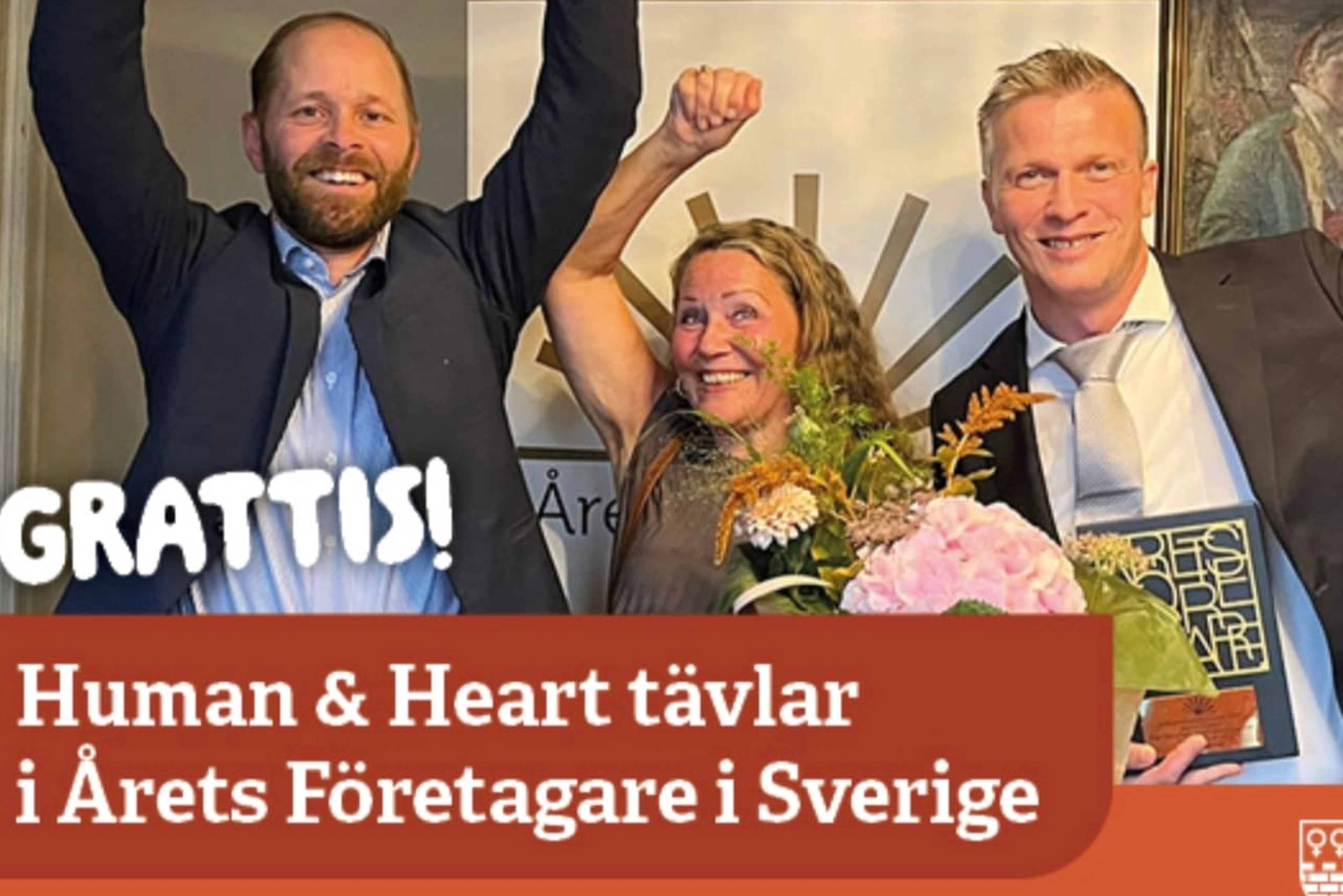 ”Grattis! Human&Heart tävlar i Årets Företagare i Sverige” står det på infartsskyltarna tillsammans med en bild på ägartrion Andreas Pernhall, Inger Klangebo och Richard Mårtensson Adin.